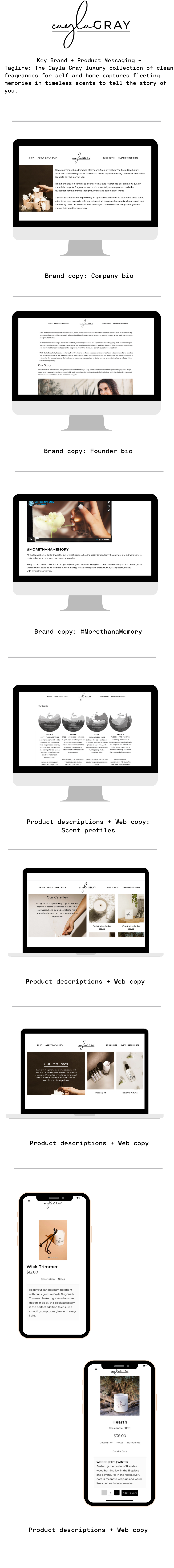 Worked directly with founder Kelly Kussman to create Cayla Gray brand voice , and cohesively unify verbiage for both retail and online objectives during the 2020 pre-launch and post-launch phases. Key messaging points includes: